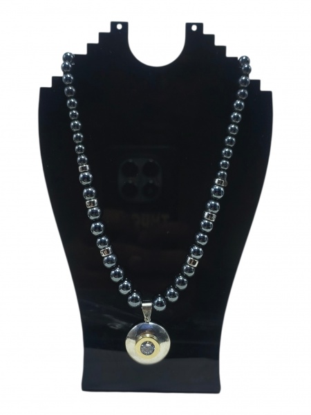 • JOIA, um (1) colar com contas em HEMATITA e PRATA DE LEI, fecho tipo lagosta, pingente circular filetado a ouro com incrustação de cristal facetado, medindo 41cm de comprimento.