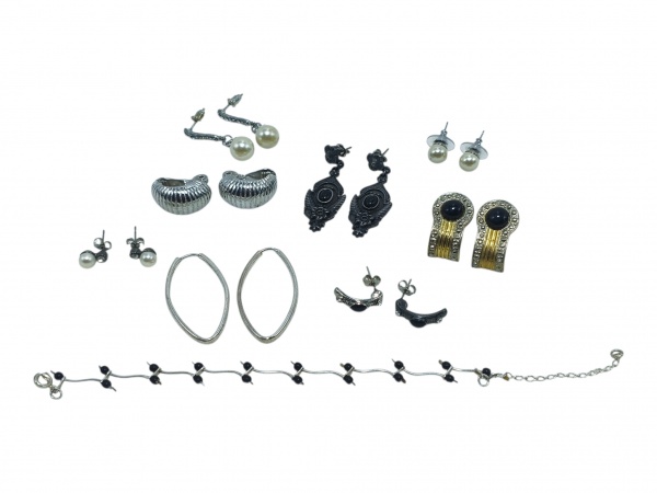 • BIJUTERIAS, lote com dezessete (17) peças de modelos, tamanhos, decorações e materiais distintos, sendo: 7 pares de brinco para orelha furada, maior medindo 4cm e menor 0,5cm, 1 par de brincos de pressão., medindo 2cm e 1 pulseira, medindo 20cm.