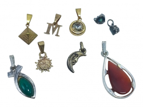 • BIJUTERIAS, lote com nove (9) pingentes de modelos, tamanhos, decorações e materiais distintos, vendidos no estado da foto, maior medindo 3cm e menor 0,5cm.