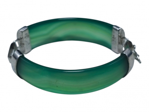 • BIJUTERIA, um (1) bracelete confeccionado em metal prateado com incrustação de pedra oval na tonalidade verde, medindo 6,5cm, sinais de uso.