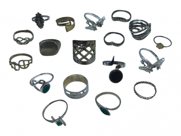 • BJUTERIAS, lote com dezoito (18) anéis de modelos, tamanhos,, materiais, decorações e aros distintos, vendidos no estado da foto. Sinais de uso.