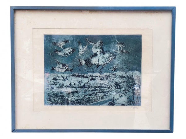 • Guima (Luis de Souza Guimarães 1927-1993), "Sem Título", prova do artista, moldura em madeira com patina azul, frente protegida em vidro, medindo 52x67cm e obra 29,5x40cm.