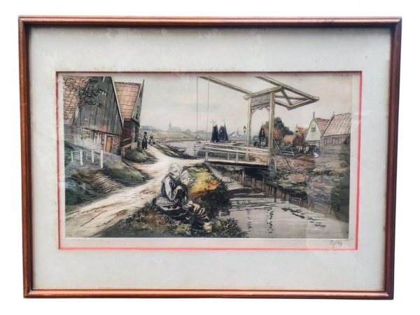 • ASS. DESCONHECIDA, uma (1) gravura colorida, representando cena campestre, pesquisas apontam um artista Legarf, sem mais resultados, moldura em madeira escura, apresenta leves marcas do tempo, medindo 53x69cm e obra 30x52cm.