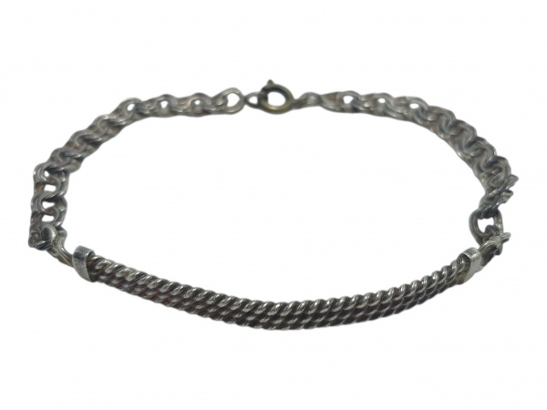 • JOIA, uma (1) pulseira, confeccionada em PRATA DE LEI, elos duplos e segmento central em torçal, fecho tipo boia em metal prateado, medindo 19cm e peso total bruto 8g.