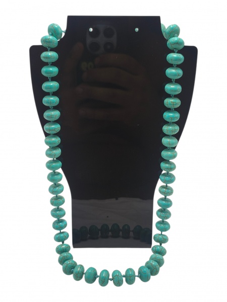 • BIJUTERIA, um (1) colar com contas ovais confeccionadas em turquesa (é um mineral fosfato de cobre e alumínio, famoso pelo tom azul-celeste ao verde), fecho tipo lagosta em metal com falhas na prateação, medindo 56cm de comprimento.
