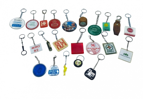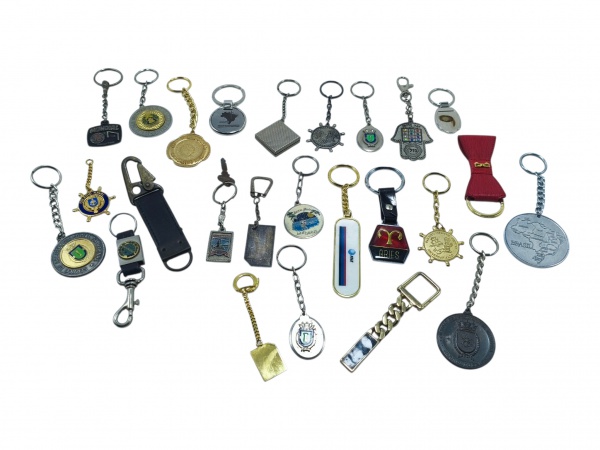 • DIVERSOS, lote com vinte e três (23) chaveiros, de modelos, tamanhos e decorações distintas, vendidos no estado da foto, alguns com ausência da argola.