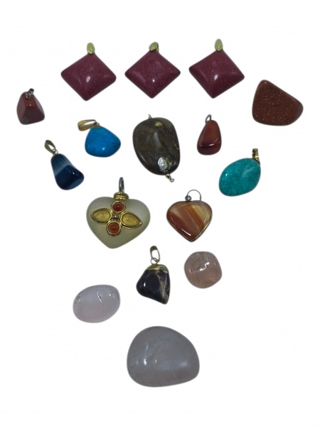 • BIJUTERIAS, lote com dezesseis (16) peças, sendo: A) 12 pingentes de modelos, tamanhos, decorações e materiais distintos, maior medindo 4x3,5cm e menor 2cm e C) 4 pedras brasileiras distintas, maior medindo 3,5x3cm e menor 2x2cm.
