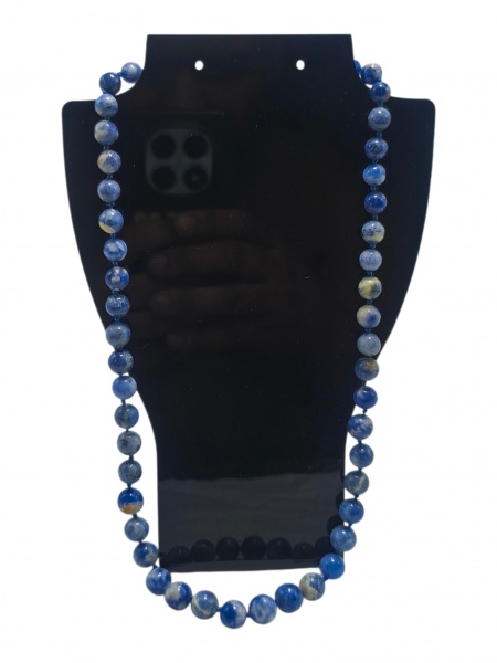 • BIJUTERIA, um (1) colar, com contas esféricas confeccionadas em ágata na tonalidade azul com realces esbranquiçados, fecho tipo rosca em metal dourado, medindo 53,5cm de comprimento.