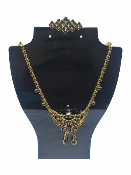 • BIJUTERIA, conjunto c/ duas (2) peças, sendo: A) colar e  B) broche, confeccionados em metal dourado, com aplicações granada. Colar de composição rendilhada, com pingente central ornado e pendentes móveis, acompanhado de broche de desenho geométrico. Peças apresentando sinais do tempo e de uso, colar medindo 42cm e broche 3,5x1,5cm.