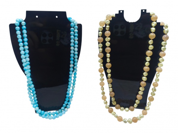 • BIJUTERIAS, dois (2) colares, sendo: A) um (1) colar de contas esféricas em tom azul possivelmente amazonita, medindo 100cm de comprimento, apresenta puído na monture de nylon e B) um (1) colar de contas em pérolas sintéticas de tom rosado intercaladas por contas esféricas de tom rosado, medindo 110cm de comprimento.