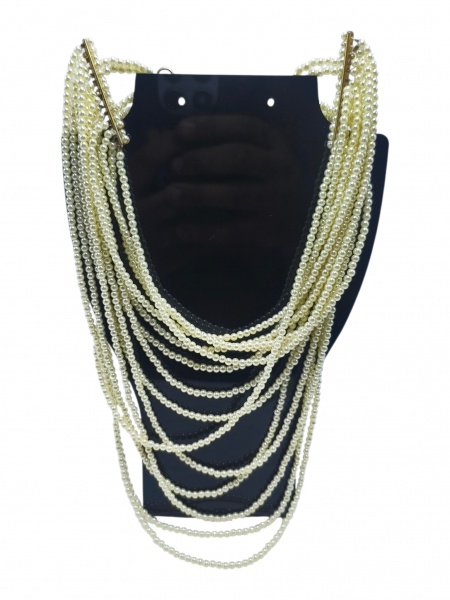 • BIJUTERIA, um (1) colar com 14 voltas com contas confeccionadas em pérolas sintéticas, com barretes e fecho tipo lagosta em metal dourado com pingente gravado AGATHA, medindo 39cm de comprimento.