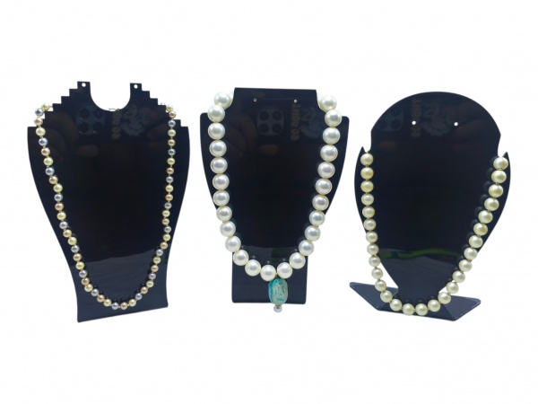 • BIJUTERIAS, três (3) colares, com contas confeccionadas em pérolas sintéticas de modelos distintos, sendo 2 com fecho em metal dourado e 1 com fecho em metal prateado, 1 com pingente na tonalidade azul, cada um medindo 45,5cm, 45cm e 46cm. Sinais de uso.
