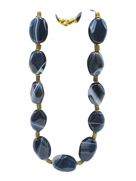 • BIJUTERIA, um (1) colar, com contas em ágata, em formato oval e irregular, em tonalidade escura com faixas naturais esbranquiçadas, intercaladas por espaçadores cilíndricos em metal dourado e missangas, medindo 48cm de comprimento.