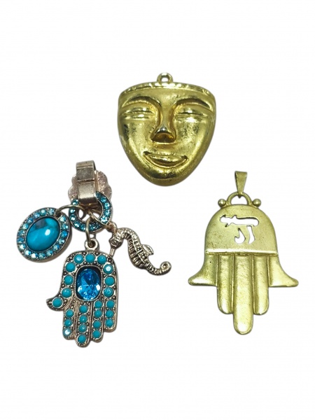 • BIJUTERIAS, lote com cinco (5) pingentes, sendo: A) um (1) pingente em metal dourado representando máscara estilizada, medindo 3x3cm; B) um (1) pingente em metal dourado representando mão de Fátima, vazada, medindo 4x3cm e  C) um (1) pingente composto por mão de Fátima, cavalo-marinho e cabochão com pedras em tons de azul 4x3cm.