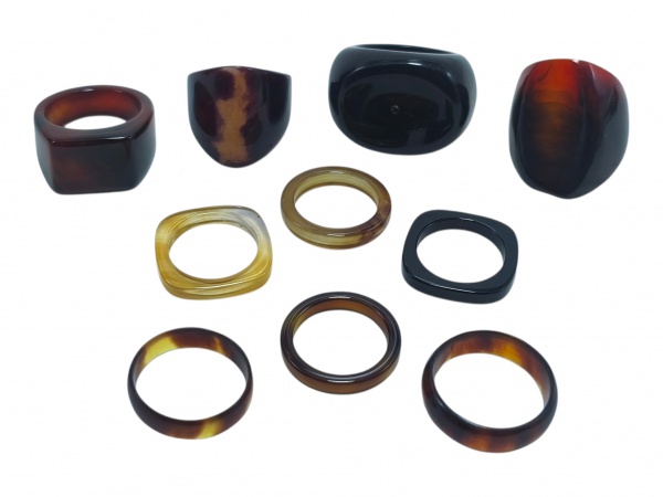 • BIJUTERIAS, lote com dez (10) anéis de modelos, tamanhos, decorações e materiais distintos, sendo: A) 2 em ônix ou similar, B) 3 em casco de tartaruga, C) 4 em quartzo de diferentes tonalidades e D) 1 em chifre polido, aros 24, 14, 20, 22, 20, 14, 21 e 17.
