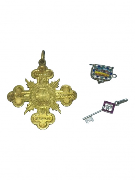 • ARTE SACRA, três (3) peças, sendo: A) um (1) pingente/cruz em PRATA DE LEI com esmaltagem em verméil, em formato de cruz estilizada com raios, de temática devocional, medindo 4x4cm,  B) um (1) pingente em formato de chave, em PRATA DE LEI, com aplicação de pequenas ametistas, medindo 2cm e C) um (1) relicário confeccionado em PRATA DE LEI esmaltada em vermeil, constrastada 800, esmaltado em policromia e interior com Menino Jesus, medindo 1,2x1cm e peso total bruto 11,5g.