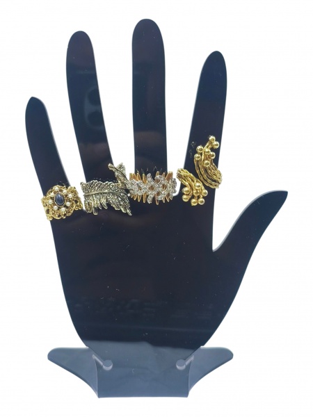 • BIJUTERIAS, lote com quatro (4) anéis, confeccionados em metal dourado, de modelos, tamanhos e decorações distintas, elos 21, 14 (ajustável), 13 (ajustável) e 18.