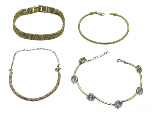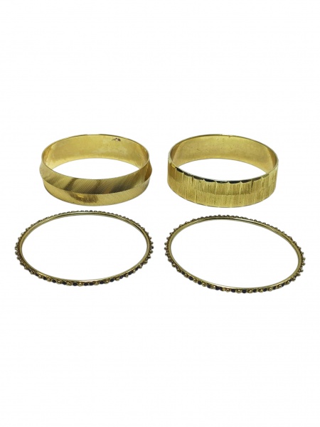 • BIJUTERIAS, lote com quatro (4) pulseiras confeccionadas em metal dourado de modelos, tamanhos e decorações distintas, medindo cada 6x5,5cm, 8x5,5cm, 18,5cm e 20cm.