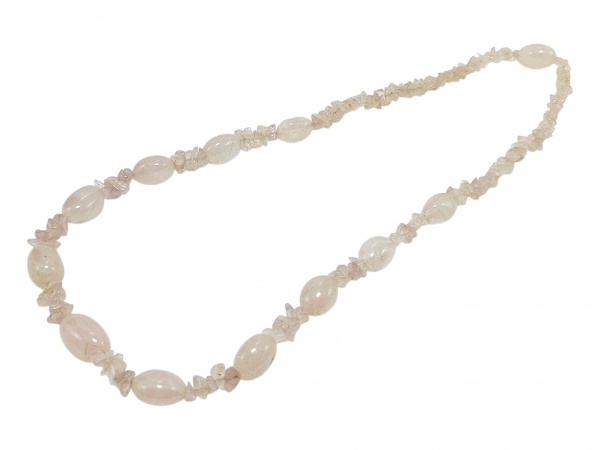 • BIJUTERIA, um (1) colar com contas ovais e cascalhos de quartzo na tonalidade rosa, medindo 36cm de comprimento.