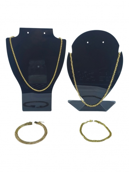 • BIJUTERIAS, lote com quatro (4) peças, sendo: A) 2 cordões e B) 2 pulseiras, confeccionadas em metal dourado de modelos, tamanhos e decorações distintas, apresentam sinais de uso, cordões medindo 45,5cm e 42cm e pulseiras 19cm e 19cm.