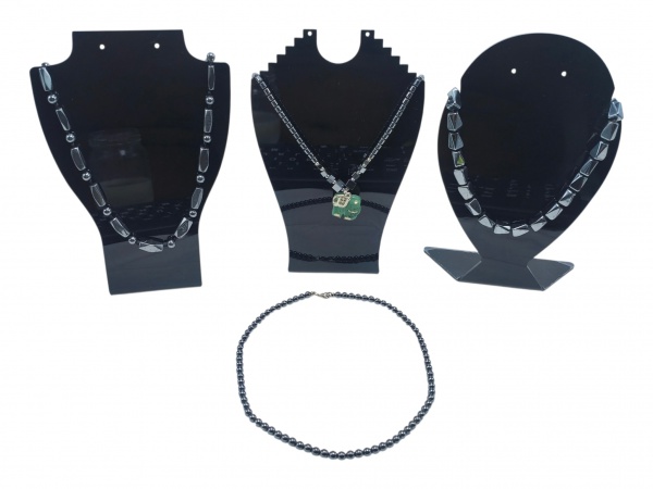 • BIJUTERIAS, lote com quatro (4) colares com contas em hematita (um mineral de óxido de ferro, principal minério para produção de aço), de modelos e tamanhos distintos, medindo cada 43cm, 46cm, 49cm e 51cm.