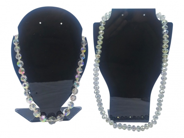 • BIJUTERIAS, dois (2) colares com contas confeccionadas em cristais facetados, sendo 1 com fecho tipo rosca em metal prateado, medindo 43,5cm de comprimento e 1 com fecho tipo lagosta em metal prateado, medindo 53cm de comprimento, fecho de rosca com falhas na prateação.