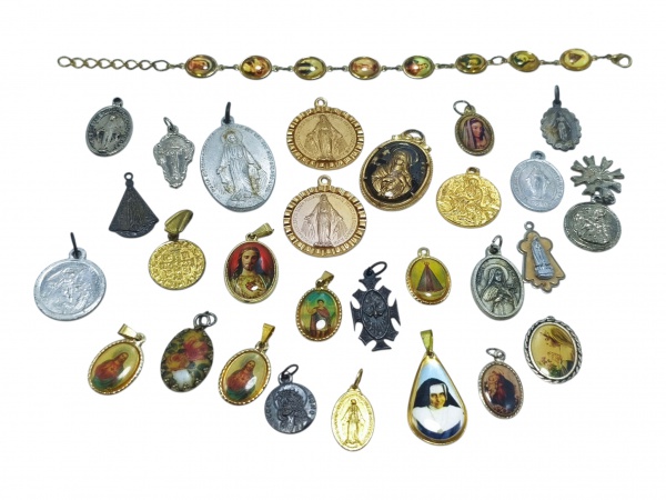 • ARTE SACRA, lote com trinta (30) peças, sendo 29 medalhas e 1 pulseira de modelos, tamanhos, materiais e figuras devocionais distintas, vendidos no estado da foto, maior peça (pulseira) medindo 20 cm e menor peça (medalha) medindo 1,5x1cm.