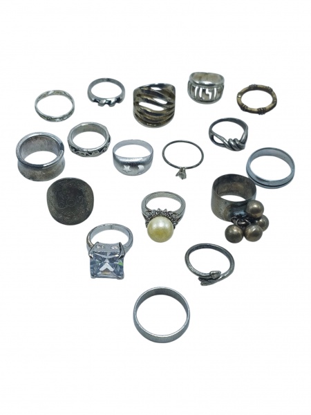 • BIJUTERIAS, dezessete (17) anéis, confeccionados em metal prateado, de modelos, tamanhos, elos e decorações distintas, alguns com falhas na prateação, vendidos no estado da foto.