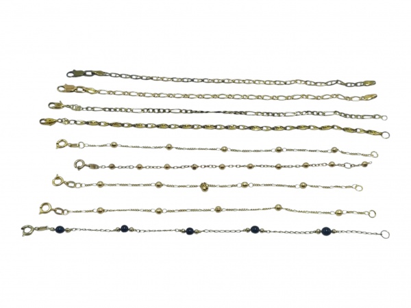 • BIJUTERIAS, nove (9) pulseiras confeccionadas em metal dourado de modelos, tamanho e elos distintos, vendidos no estado da foto, alguns com falhas na douração, maior medindo 19,5cm e menor 16cm.
