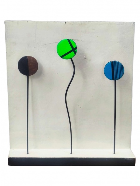 • ESCULTURA, uma (1) escultura cinética confeccionada em ferro e madeira, caracterizada por elementos geométricos e movimento visual, medindo 29,5x26,5cm.