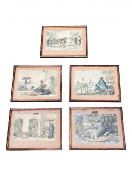 • QUADROS, cinco (5) pequenas gravuras coloridas, representando cenas de costumes e cotidiano, com personagens em atividades diversas, protegidas por vidro e emolduradas. Apresentando sinais do tempo, medindo 21x26,5cm.