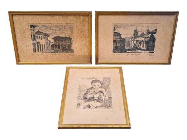 • QUADRO, três (3) gravuras em preto e branco, sendo: A) vista urbana intitulada Rua de Diamantina; B) vista urbana intitulada Largo de Diamantina; C) composição figurativa intitulada O menino e o cão. Todas protegidas por vidro e emolduradas, apresentando sinais do tempo, sendo as peças com manchas de oxidação no papel, medindo 26x36cm e 36x26cm, falhas nas molduras.