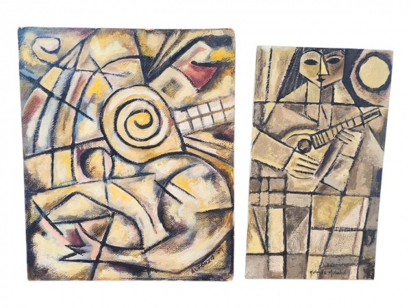 • QUADRO, duas (2) pinturas sobre tela, sendo: A) composição abstrata, sobre eucatex, assinada Alfronzo no canto inferior, datado de 1979, medindo 32x26,5cm B) composição cubista/figurativa, sobre eucatex, representando personagem com instrumento musical, possivelmente assinada Yutride Myhalya no canto inferior, medindo 29,5x16,5cm.