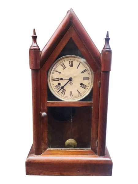 • RELÓGIO ANSONIA (tradicional fabricante norte-americana de relógios, fundada em 1851, em Connecticut, Estados Unidos, destacando-se pela produção de relógios de parede, mesa e estante no século XIX e início do século XX), um (1) relógio de mesa, estante ou cornija, dito CAPELINHA, com mostrador circular apresentando numeração romana e dois furos para corda, caixa confeccionada em madeira, com frontão em formato arquitetônico e laterais torneadas, visor frontal em vidro, acompanhando pêndulo e chave, não testado e sem garantia de funcionamento, medindo 54x29cm, leves falhas na madeira, vide foto e no mostrador.