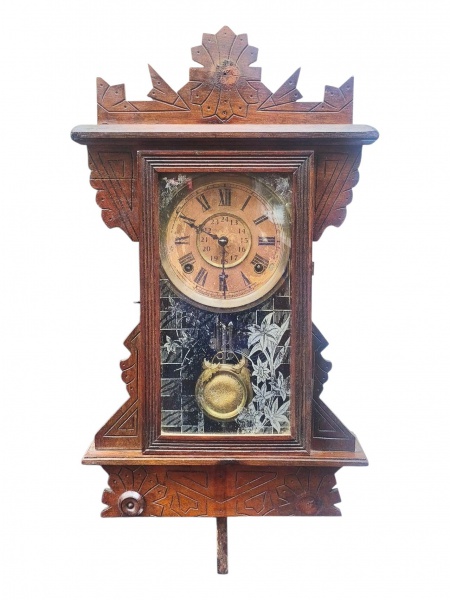 • RELÓGIO ANSONIA (tradicional fabricante norte-americana de relógios, fundada em 1851, em Connecticut, Estados Unidos, tornando-se célebre pela produção de relógios de parede, mesa e estante no século XIX e início do século XX), um (1) relógio de parede, com mostrador circular apresentando numeração romana e numeração interna complementar, dois furos para corda, caixa confeccionada em madeira com frontão recortado e entalhado, porta frontal envidraçada com decoração floral, acompanhando pêndulo e chave. Apresentando sinais do tempo, desgastes no mostrador, marcas de uso e pequenas perdas de adornos. Usado, não testado e sem garantia de funcionamento, medindo 55,5x33,5cm.