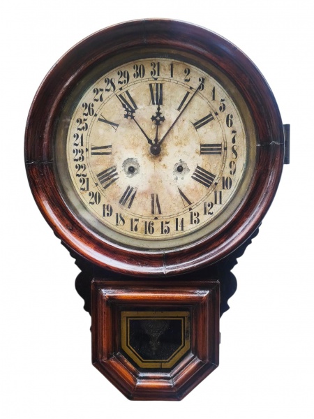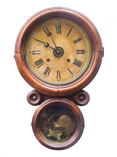 • RELÓGIO ANSONIA (tradicional fabricante norte-americana de relógios, fundada em 1851, em Connecticut, Estados Unidos, destacando-se pela produção de relógios de parede, mesa e estante no século XIX e início do século XX), um (1) relógio de parede, com caixa confeccionada em madeira, apresentando frontão arqueado, elementos torneados e laterais recortadas, aplique de cabeça de Minerva, mostrador circular com numeração romana e dois furos para corda, porta frontal envidraçada com decoração e visor para visualização do pêndulo. Apresentando sinais do tempo, desgastes no mostrador e marcas de uso. Usado, não testado e sem garantia de funcionamento. Porta solta, bilro colado e com bicado, medindo -70x33cm.