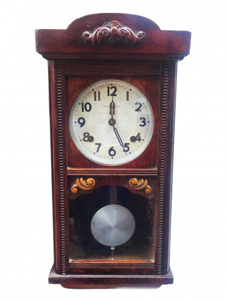 • RELÓGIO, um (1) relógio de parede, possivelmente da marca Showa, com caixa confeccionada em madeira, mostrador circular com numeração arábica e dois furos para corda, visor inferior envidraçado para visualização do pêndulo, apresentando ornatos entalhados e colunas laterais. Apresentando sinais do tempo, desgastes no mostrador e marcas de uso. Usado, não testado e sem garantia de funcionamento. Acompanha pêndulo e chave, possui sinais de cupim tratado, medindo 54x25,5cm.