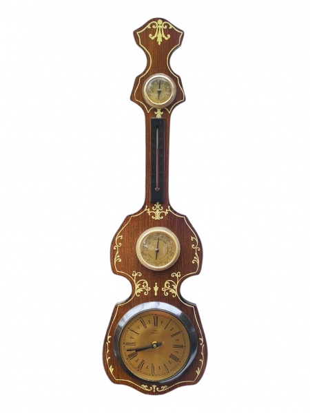 • RELÓGIO JUNKER (marca alemã ligada à tradição relojoeira e de instrumentos domésticos de medição, conhecida por produzir relógios e conjuntos murais de uso decorativo e funcional no século XX), um (1) conjunto mural em madeira, com aplicações decorativas, composto por relógio com mostrador de numeração romana, termômetro, barômetro e higrômetro, maquina do relógio a pilha com ausência do visor frontal, não testado e sem garantia de funcionamento, medindo 85x24cm.