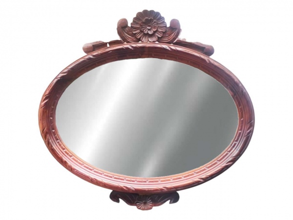 • ESPELHO, um (1) espelho oval, com moldura em madeira escura, com entalhes representando elementos florais e frisos torcidos, medindo 63x68cm.