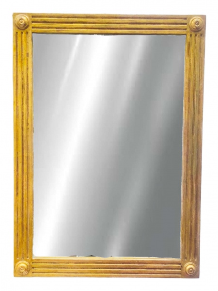 • ESPELHO, um (1) espelho retangular, com moldura confeccionada em madeira com folha de ouro, entalhada por caneluras e forma redonda, medindo 70x50cm.