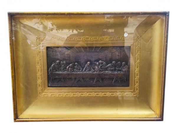 • ARTE SACRA, uma (1) placa retangular, confeccionada em metal espessurado a prata. representando Santa Ceia, acondicionada em moldura em madeira com folha de ouro e frente protegida em vidro, medindo 42x58,5cm.