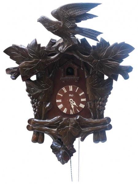 • RELÓGIO, um (1) relógio "CUCO" da manufatura REI, caixa confeccionada em madeira nobre, com entalhes retratando pássaros, folhagens e troncos, números romanos, acompanha correntes e pesos de ferro, acompanha pêndulo e correntes, ausência da porta do cuco, não testado e sem garantia de funcionamento, medindo 61x43cm.