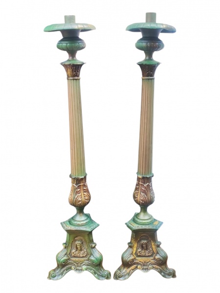 • ARTE SACRA, um (1) par de tocheiros em bronze patinado, com fustes altos de corpo canelado, bocéis torneados e pratos superiores para apoio de velas. Bases de feição neobarroca, ricamente ornamentadas em relevo, com reservas apresentando imagens do Sagrado Coração de Jesus e do Sagrado Coração de Maria, ladeadas por volutas, folhas estilizadas e elementos concheados. Peças de forte caráter decorativo e litúrgico, apresentando sinais de oxidação e leves mossas nas bobeches, medindo 104cm de altura.
