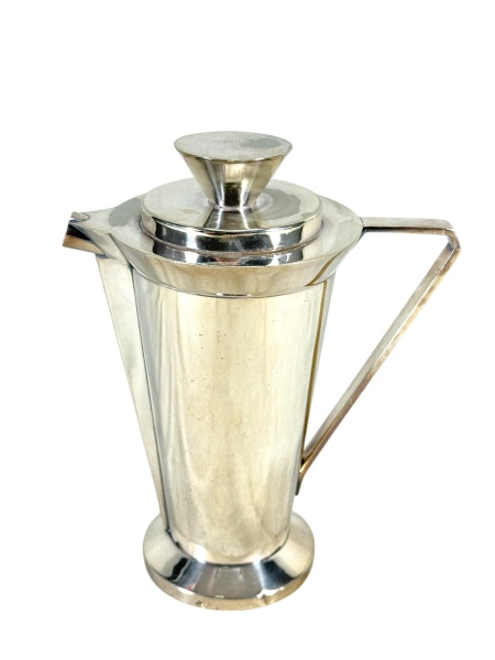 • METAL PRATEADO / WOLFF - (1) Coqueteleira confeccionada em metal espessurado à prata , corpo liso , tampa no feitio de disco e alça vazada geométrica , medida : 23,5 cm