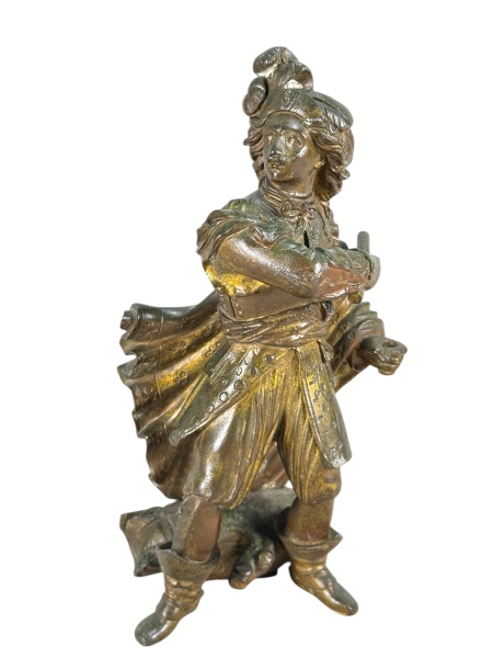 • ESCOLA FRANCESA, uma (1) escultura confeccionada em bronze representando Fidalgo da Corte do Rei Luís XV, possivelmente c. 1900, medindo 21,5cm de altura.