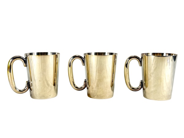 • METAL PRATEADO / BELPRATA - Lote com (3) canecas confeccionadas e metal espessurado à prata da manufatura Belprata , com corpo liso de formato levemente cônico e alças laterais vazadas. Medida : 11,5 x 9 cm