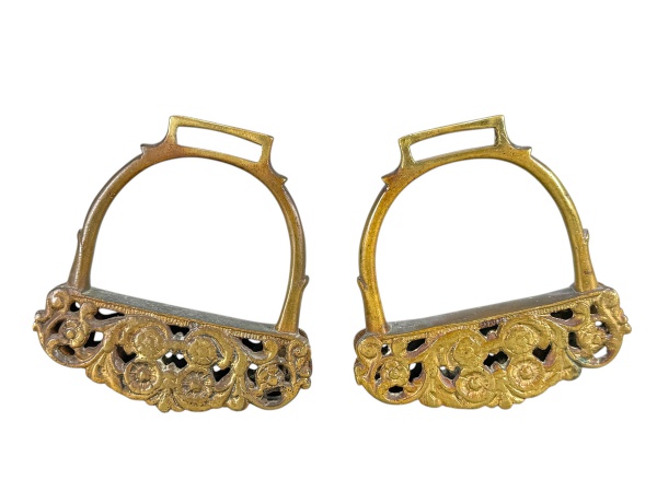 • BRONZE - Par de estribos confeccionados em bronze , com armações arqueadas e bases vazadas, ornadas por motivos florais e volutas em relevo , medida : 13 x 13 cm