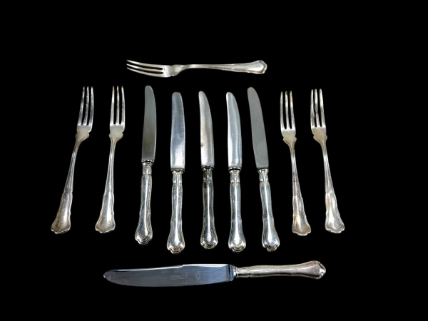 • METAL PRATEADO, onze (11) peças confeccionadas em metal espessurado a prata, cabo cinzelado por caneluras com recortes, sendo; A) 6 garfos para sobremesa e B) 6 garfos para sobremesa, alguns com lâminas trocadas, apresentam sinais de uso.