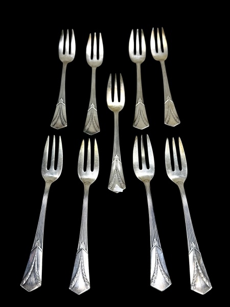 • WMF Wurttembergische Metallwarenfabrik (A empresa foi fundada em 1853 por Daniel Straub e os irmãos Schweizer. Em 1880, a Württembergische Metallwarenfabrik AG foi criada através de uma fusão com a Ritter & Co.), nove (9) garfos para bolo confeccionadas em alpacca com cinzelado ao gosto art noveau, por folhagens, recortes e caneluras.