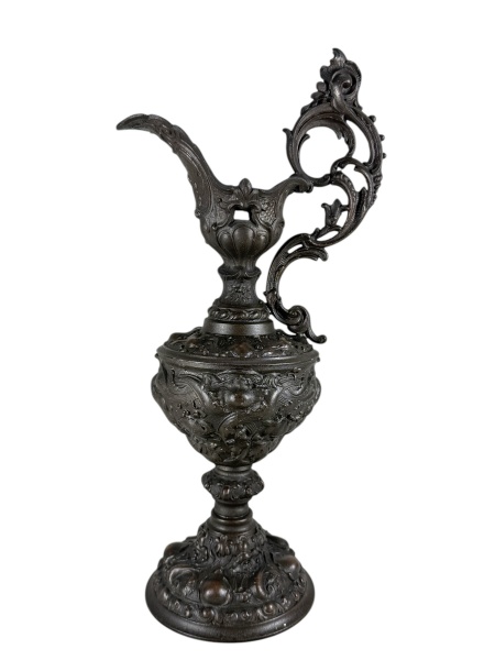 • ESTANHO, um (1) grande tankard confeccionado em estanho com patina na tonalidade bronze, ricamente cinzelada por elementos vegetalistas e alça curva encimada por figura angelical e pega da tampa representando figura masculina, medindo 48cm de altura, apresenta leve mossa na borda.